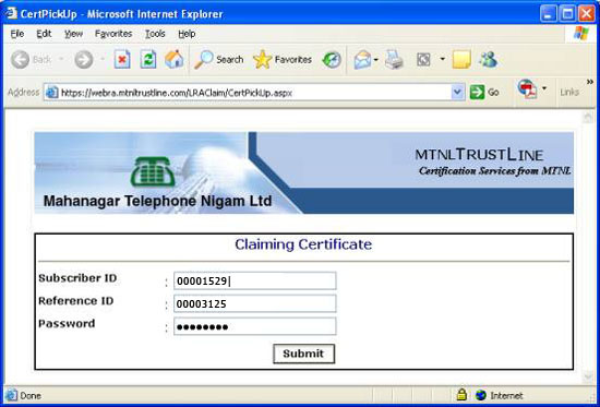 2. Enter the Subscriber ID which was received in Email 1 and the Reference ID and Password that was received in Email 2 and click on Submit. Next screen is shown as below: