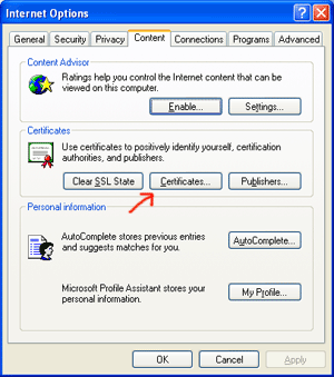 • Select the 'Content' tab on the top and then click the button labelled 'Certificates'.