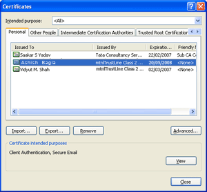• Click the 'View' button after selecting the Certificate from the list shown above.See picture below