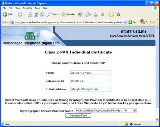 3. In the Cryptographic Service Provider Name Option Box, select Microsoft Enhanced Cryptographic Provider v1.0 and click on Generate Keys. Three message boxes as shown below comes. Click (Yes / OK) to Continue in all the three Message Boxes.